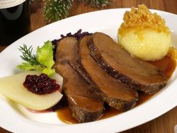 Den Wildbraten zugedeckt bei kleiner Flamme ca. 2,5 Std. weich schmoren. Das Fleisch aus dem Bräter nehmen und in Alufolie gewickelt warm halten. Die Sauce durch ein Sieb gießen und noch einmal reduzieren lassen. Nur wenn nötig mit etwas Speisestärke binden.